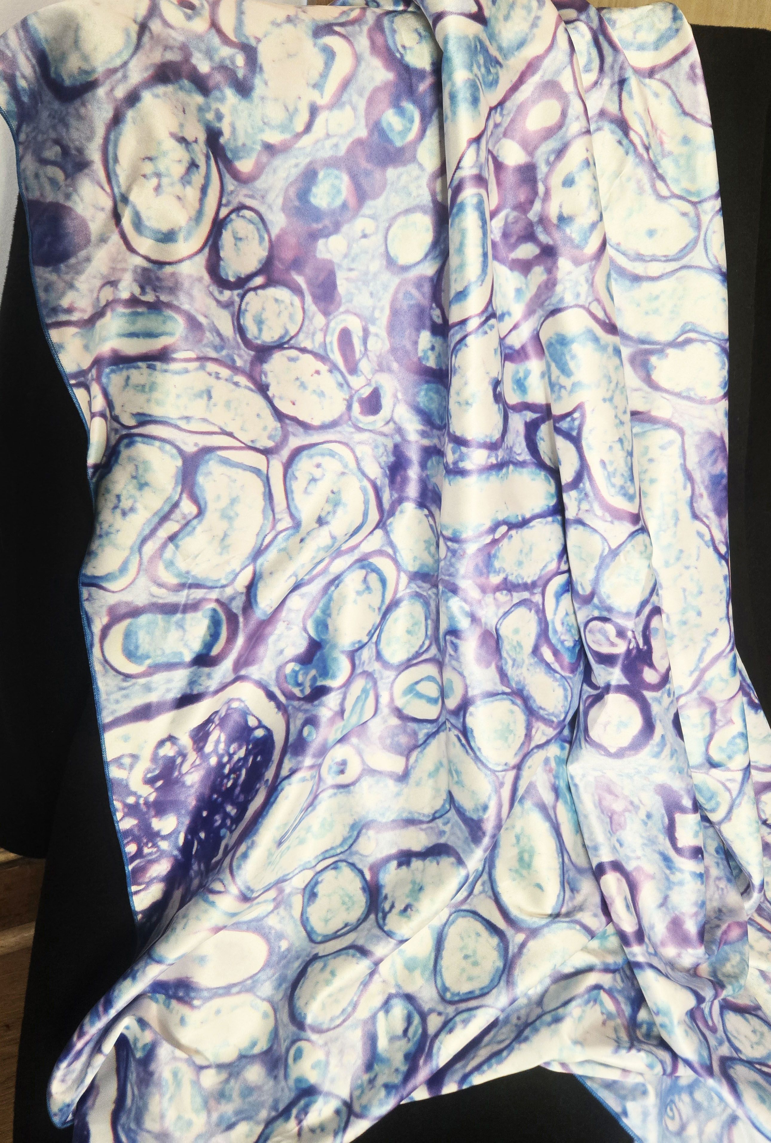 Kidney Tubules by Marianne Hamel, Forensic pathologist, Jersey Shore Forensics, Bethlehem, PA, USA. Nikki Johnson, Forensic photographer, New York City. PAS stain of kidney tubules, 400X, shot on an Olympus DP26 digital camera. Turned into a 36 x 36 inch silk scarf with contrast stitching by Contrado.com for Death Under Glass.