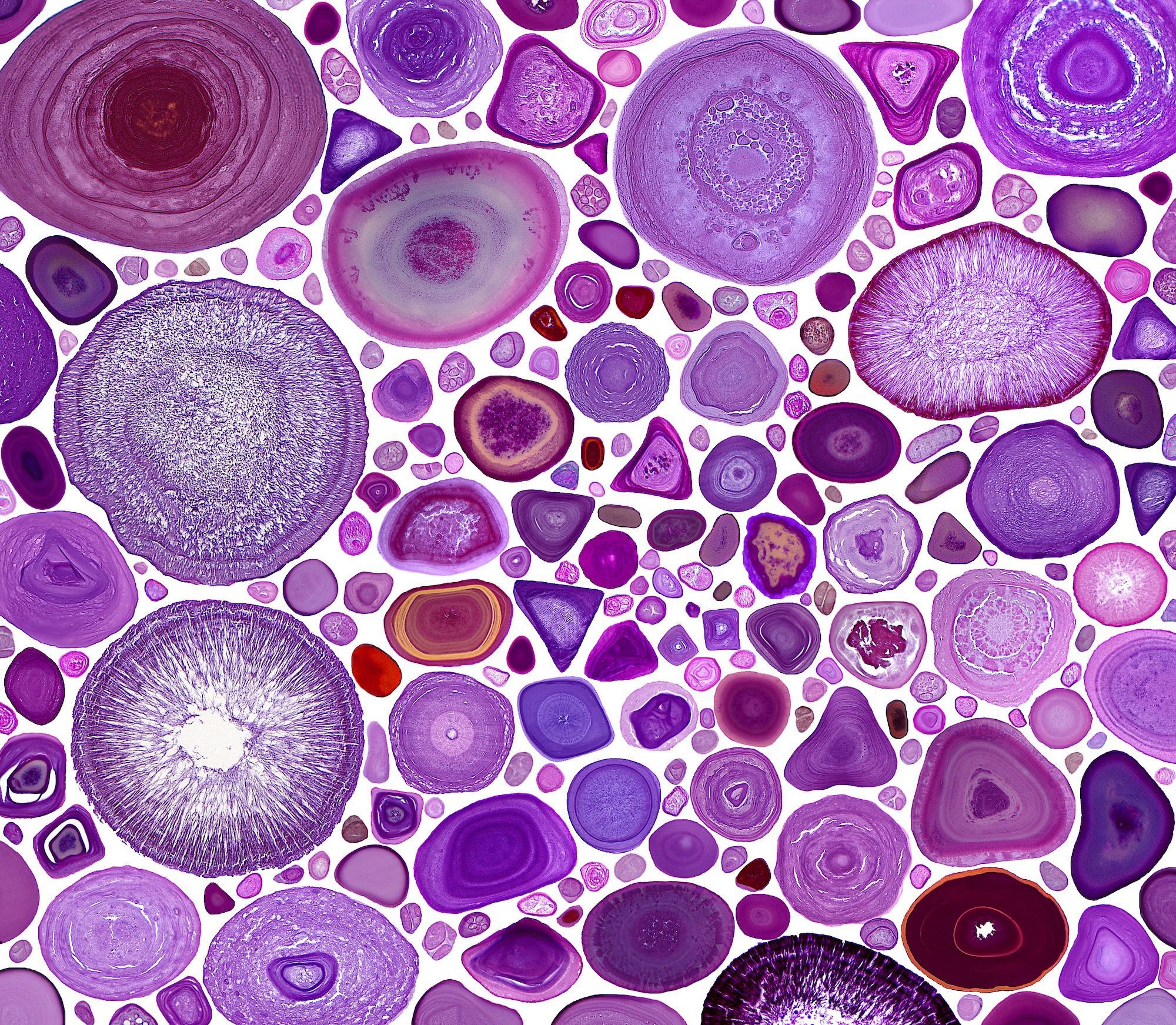 Gems by Ziad El-Zaatari, Houston Methodist Hospital, Houston, Texas USA. This image is a collage of corpora amylacea photographed during microscopic examination of prostates removed as treatment for prostate cancer. More than 150 corpora amylacea are shown, captured from at least 20 different prostates. They share recognizable features – lamellated (ring-like) layers, oval-round or polygonal shapes, and occasional fractures in tissue sections – yet no two look exactly alike, and their sizes vary widely. Their function is still debated, but they are generally thought to help collect and remove cellular waste. Importantly, corpora amylacea are a normal finding in benign prostate glands and are rarely seen in cancerous glands. Note: Images were taken at 4× to 40× magnification and digitally scaled so their relative sizes match how they would appear at 40×.