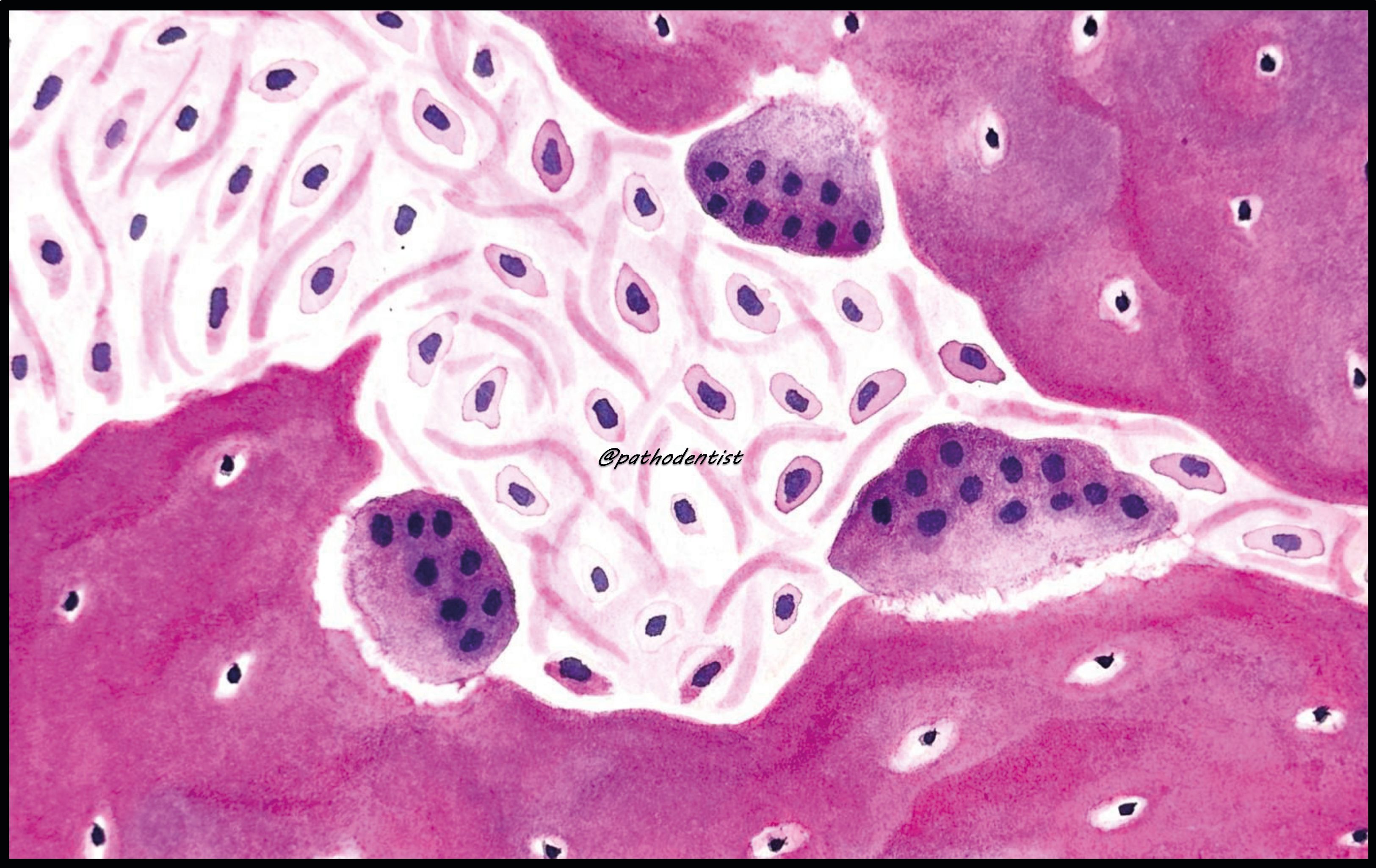 Osteoclasts by Pranjali Mandurkar, Oral and Maxillofacial Pathologist, Goa Dental College and Hospital, India. A watercolour artwork illustrating osteoclasts in the process of bone resorption.