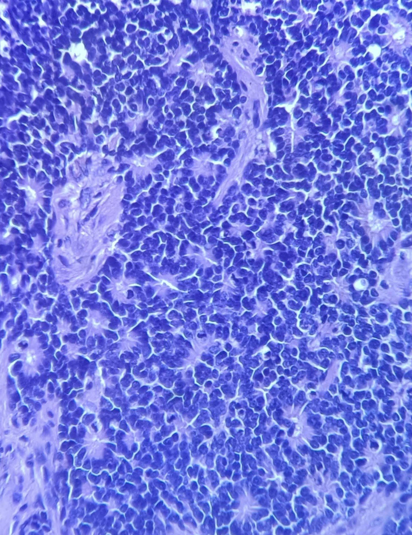 The Rosette Roadmap of Retinoblastoma by Poonam Arora Agrawal, Consultant Histopathologist, CentraPath labs, Indore, India. Microscopic image of retinoblastoma (hematoxylin and eosin stain, ×400 magnification) demonstrating characteristic rosette-like structures formed by tumor cells, including Flexner–Wintersteiner rosettes (with a central lumen), Homer–Wright rosettes (without a central lumen), and pseudorosettes (surrounding a central vascular space).
