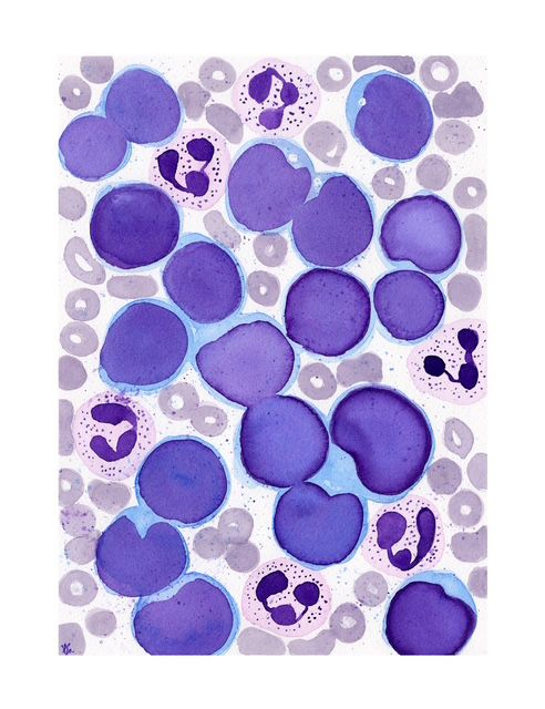 Hairy Cell Leukemia by Virginia Fernandez, Pathology Resident, Department of Pathology and Laboratory Medicine, University of Miami Health System/Jackson Memorial Hospital, USA. Large lymphoid cells with abundant pale cytoplasm and irregular borders dominate the field, giving rise to the characteristic “hairy” appearance. Watercolor illustration.