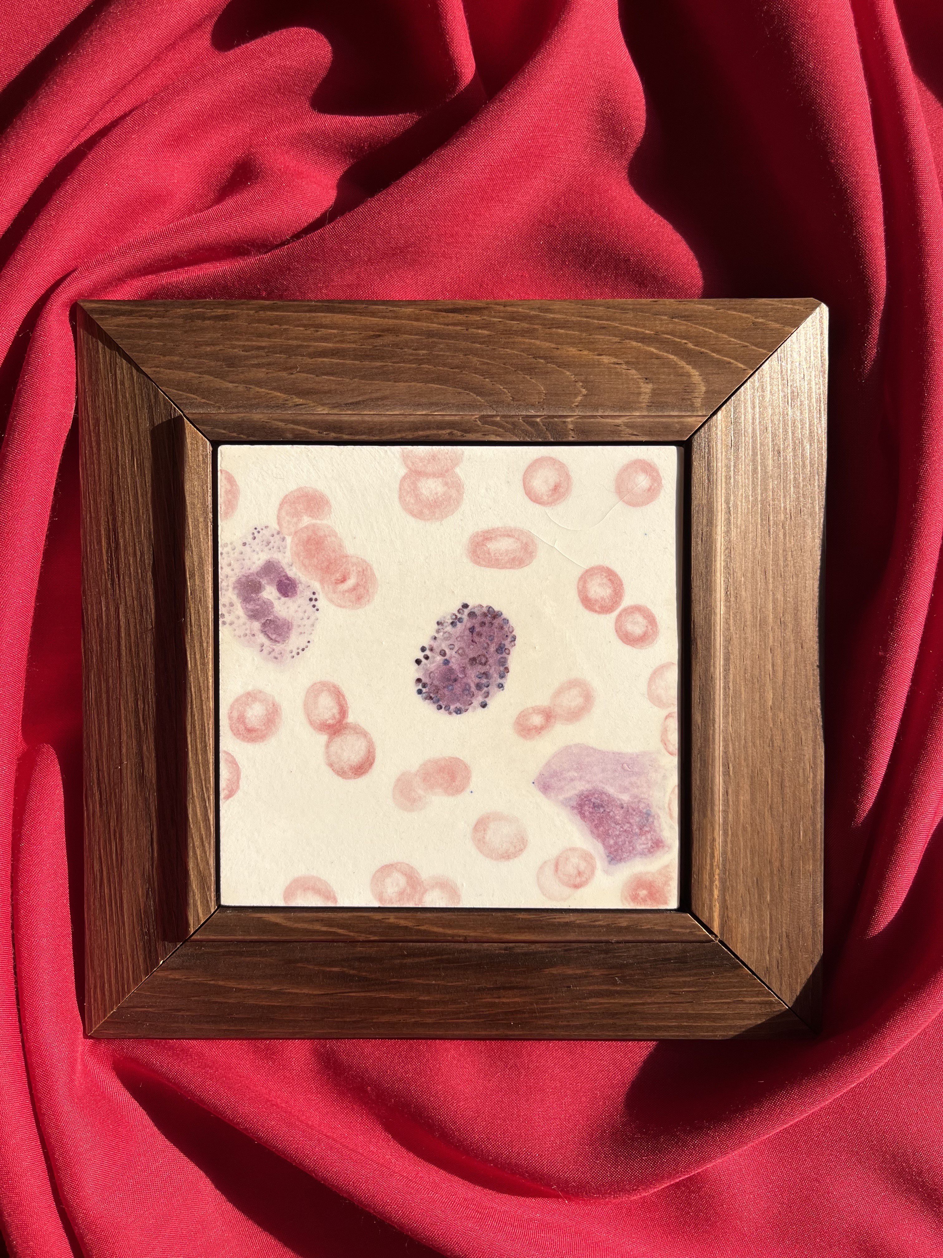 Peripheral blood smear with a central mast cell by Selim Surer, PGY-1 pathology resident at Malatya Inonu University, Turkey. I combine visually aesthetic histopathological images I come across during my training with traditional handmade tilework; to my knowledge, it could be a world first. It is a way to express my love for pathology and keep in touch with my heritage.